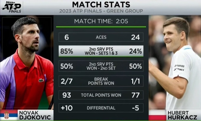 Состоялся матч последнего тура Зеленой группы на Итоговом турнире АТР 2023, в котором играли серб Новак Джокович и поляк Хуберт Хуркач, который заменил травмированного Стефаноса Циципаса.