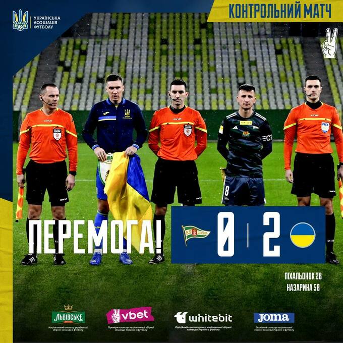 Сборная Украины (2-й тайм): Бущан (Трубин, 60), Миколенко, Забарный, Сваток, Тымчик, Назарина (Степаненко, 60), Зинченко (к), Судаков, Мудрик, Цыганков, Сикан (Довбык, 60).