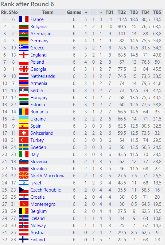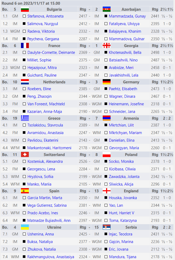 В 6-м туре украинки (4-я команда турнира по рейтингу) разошлись миром с командой Сербии (2:2). На всех досках партии завершились вничью, состав команды на тур был таким: Ушенина, Букса, Жукова, Рахмангулова.
