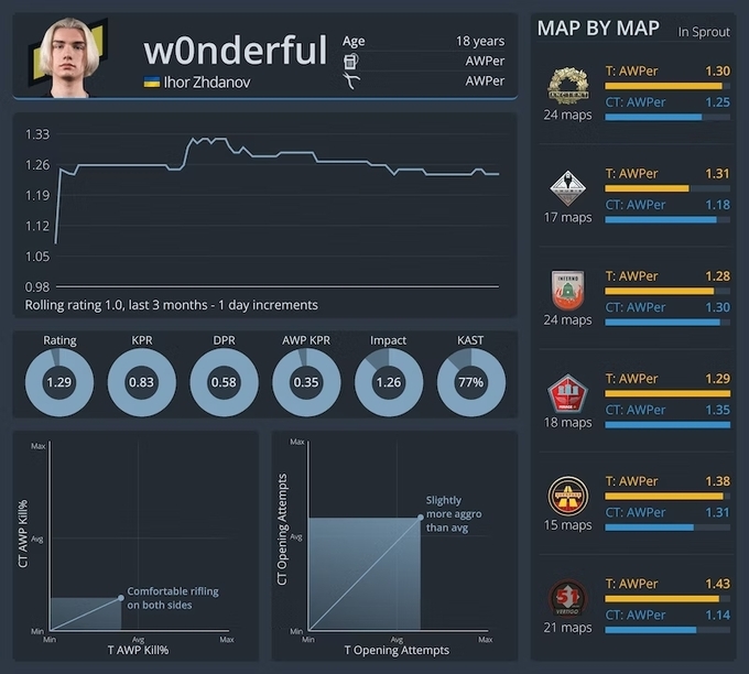 w0nderful вырос во времена расцвета Александра s1mple Костылева. Тот трижды занимал первое место в рейтинге 20 лучших игроков года по версии HLTV и имел средний рейтинг 1,29 с июля 2016 года по конец 2022 года.