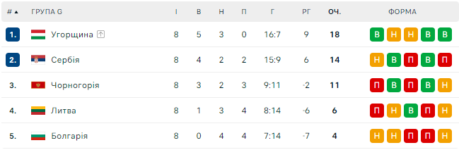 Итоги группы G: Венгрия (18), Сербия (14), Черногория (11), Литва (6), Болгария (4).