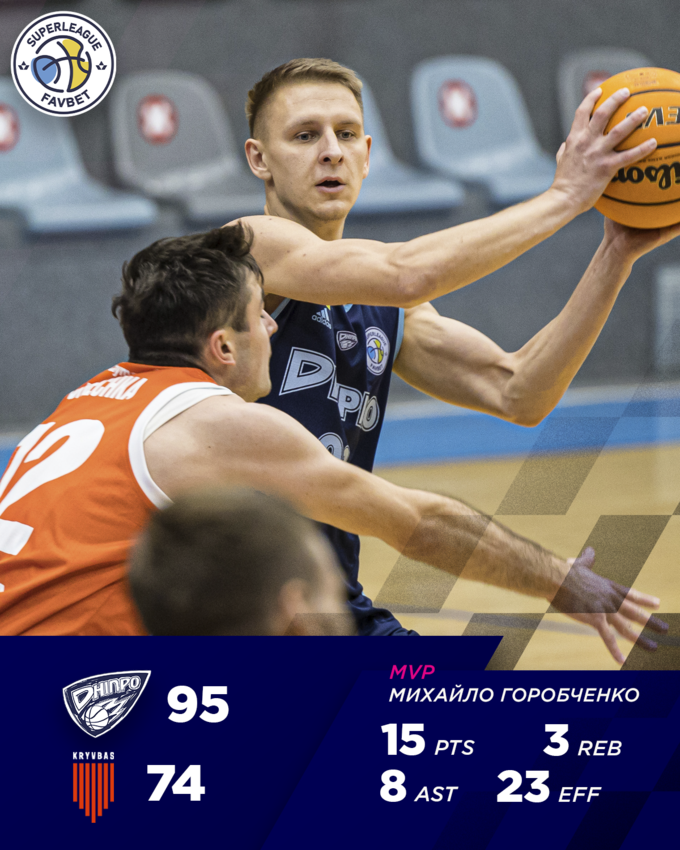 «Днепр» уверенно обыграл криворожский «Кривбасс». У днепрян пятеро игроков набрали более 10 очков, а самым результативным стал Михаил Горобченко с 15 очками и 8 передачами.