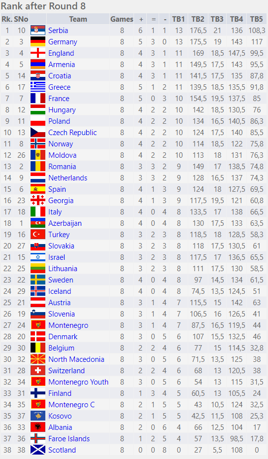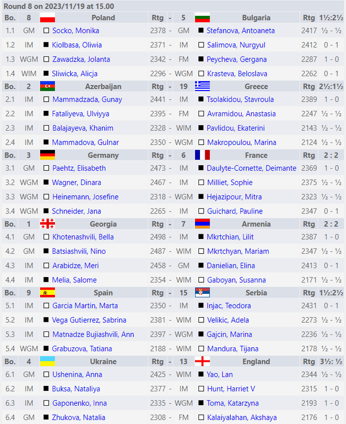 В предпоследнем 8-м туре украинки (4-я команда турнира по рейтингу) обыграли команду Англии (3.5:0.5). Свои партии выиграли Букса (2-я доска), Гапоненко (3-я) и Жукова (4-я). Вничью завершились партия Ушениной на 1-й доске.