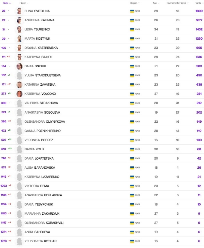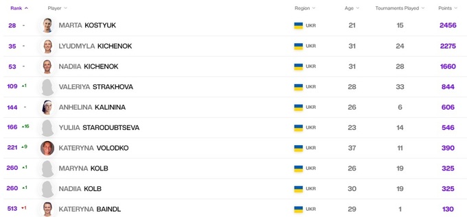Среди украинок следует отметить очередной прогресс Юлии Стародубцевой, которая продолжает постепенно подниматься в рейтинге. Она вже 152-я, в очередной раз обновив личный рекорд. Катарина Завацкая опустилась на 17 мест, Катерина Байндл – на два. Зато добавили Катерина Володько, Вероника Подрез и Надежда Колб.