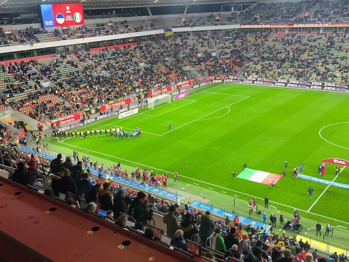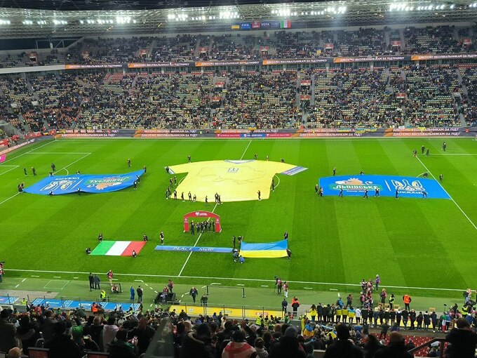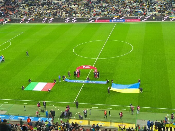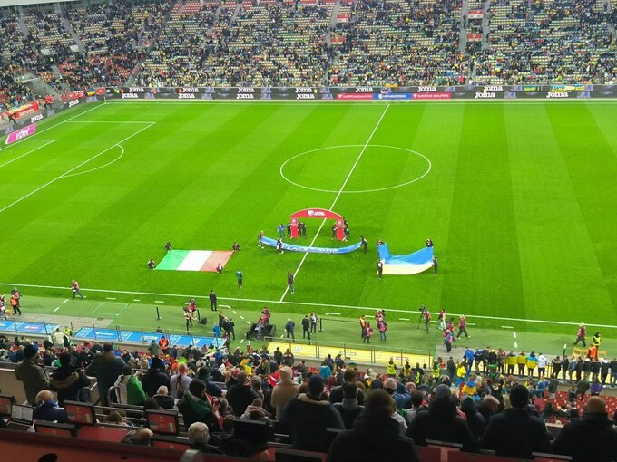 На арену были вынесены флаги стран, Украины и Италии. На поле появилась также большая футболка сборной Украины. Скоро раздастся стартовый свисток.