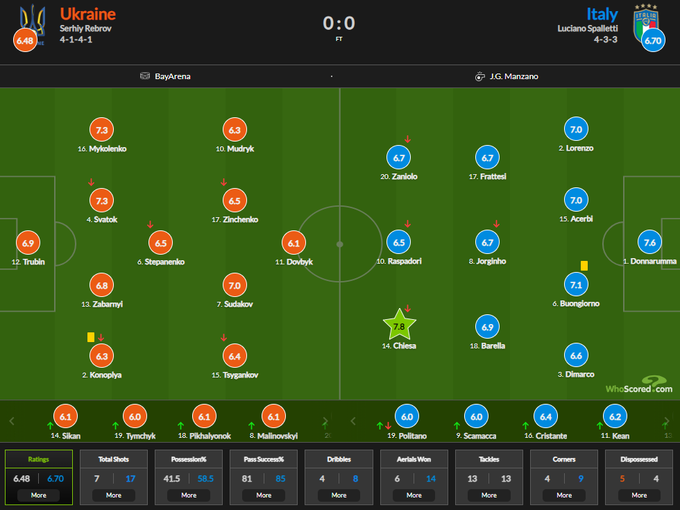 Бились до конца. Сборная Украины не сумела обыграть Италию Лучшую оценку в матче получил левый вингер итальянцев Федерико Кьеза (7.8).