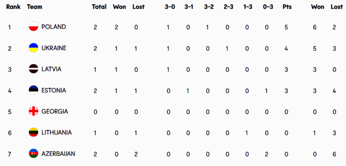 Турнирную таблицу на данный момент возглавляет сборная Польши, у которой 5 очков. Украина с 4 очками на втором месте.