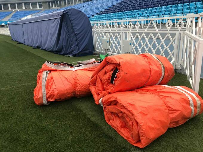 Работники стадиона постелили на футбольное поле специальную пленку-утеплитель.