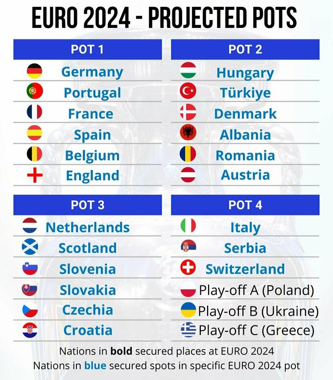 Еще три команды будут определены в плей-офф квалификации в марте 2024 года, в котором примут участие 12 команд, среди них и сборная Украины. Эти три команды попадут в корзину 4.