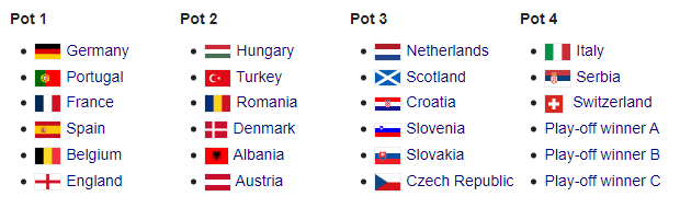 - Корзина 4: Италия, Сербия, Швейцария, три победителя плей-офф квалификации