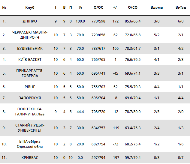 Единственной командой, прошедшей первый круг со 100% результатом, стал Днепр, закономерно возглавляющий турнирную таблицу. За ним с 7 победами в 10 матчах следуют Черкасские Мавпы и Будивельник, причем именно черкасская команда занимает вторую строчку, ведь обыграла киевлян в очной встрече.