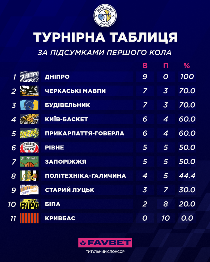 В регулярном чемпионате Суперлиги завершился первый круг. Все команды сыграли по 10 матчей за исключением Днепра и Политехники-Галичины – они не успели доиграть свой матч из-за воздушных тревог.