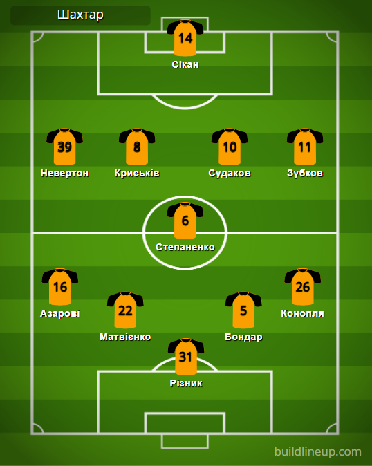 «Шахтер»: Ризнык – Азарови, Матвиенко, Бондарь, Конопля (Гочолеишвили, 11) – Степаненко – Невертон (Кащук, 77), Судаков, Крыськив, Зубков – Сикан (Келси, 73).