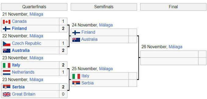 22 ноября была определена полуфинальная пара в верхней части турнирной сетки. Финляндия разыграет путевку в финал с Австралией.