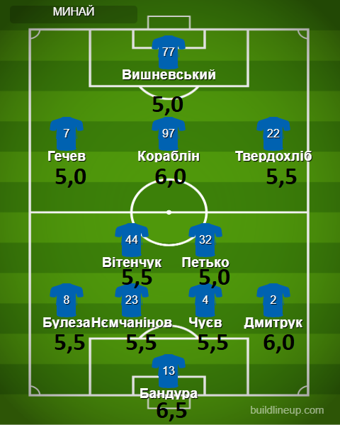 Замены Миная: Одарюк - 5,5, Гуничев - б/о, Ралюченко - б/о, Демиденко - б/о.