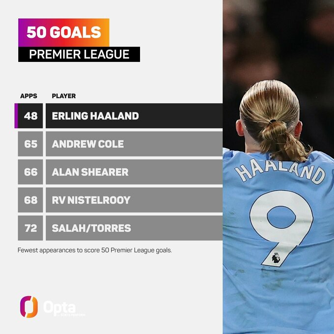 Для норвежца этот гол стал 50 в АПЛ, для этого Холанду понадобилось 48 матчей. Это новый рекорд лиги. Ранее лучшими по этому показателю были Энди Коул (65 матчей), Алан Ширер (66) и Рууд ван Нистелрой (68).