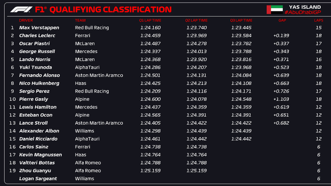 Состоялась квалификация в рамках последнего этапа сезона Формулы-1 в Абу-Даби. Поул выиграл пилот Ред Булла Макс Ферстаппен, который опередил Шарля Леклера и Оскара Пиастри.