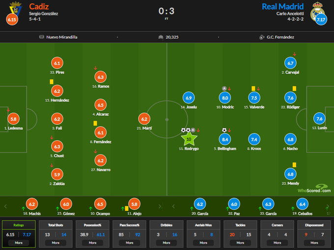Родриго за свой перформанс получил максимальную оценку 10.0. Игру Беллингема оценили отметкой 8.4, у Луки Модрича – 8.0.
