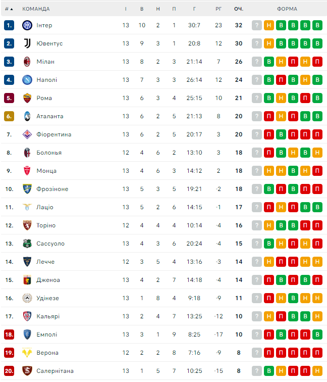 В Серии А лидирует Интер (32 очка), «Ювентус» занимает 2-е место (30 баллов).
