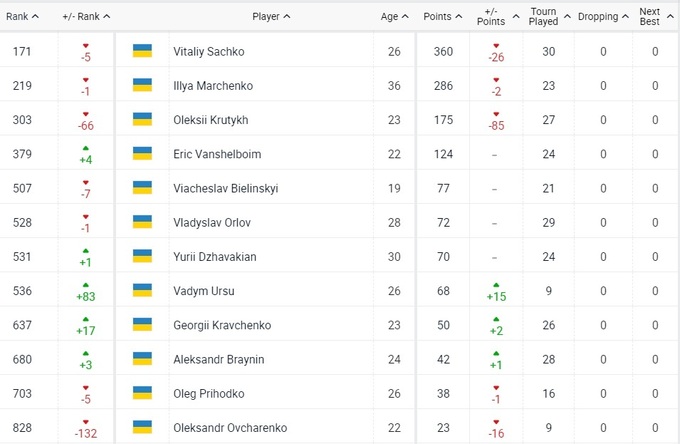 У лучших среди украинцев не повода для радости. Виталий Сачко потерял 5 позиций, Илья Марченко – одну, а Алексей Крутых не смог защитить прошлогодний титул в Валенсии и опустился в четвертую сотню мирового рейтинга. Продолжает понемногу обновлять личные достижения Эрик Ваншельбойм, он уже 379-й. Вадиму Урсу дошли очки за титул ITF в Египте, он также обновил личный рекорд. Как и Юрий Джавакян, а также Александр Брайнин.