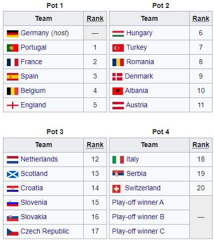 - Корзина 4: Италия, Сербия, Швейцария, три победителя плей-офф (Путь A, B, C)