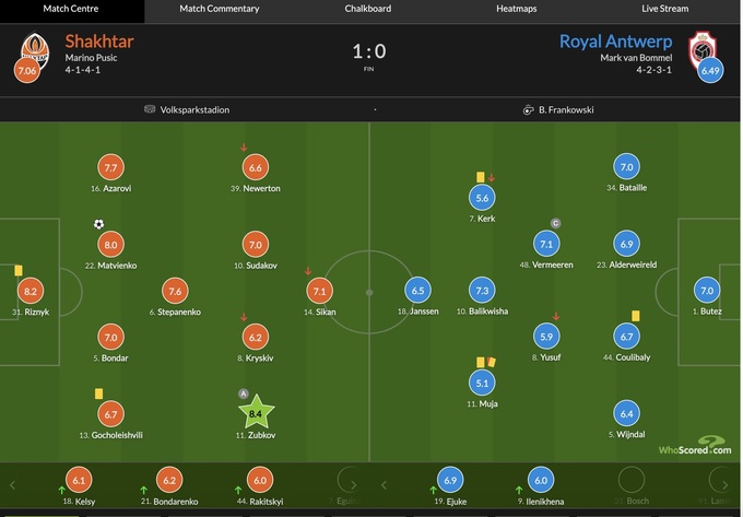 Оценки матча «Шахтер» – «Антверпен» от портала WhoScored.