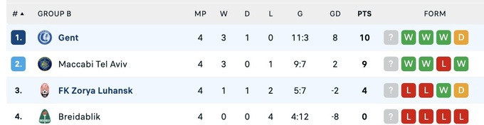 После четырех матчей группового этапа луганская «Заря» занимает третье место в группе B с четырьмя очками, а «Гент» идет первым с десятью баллами.