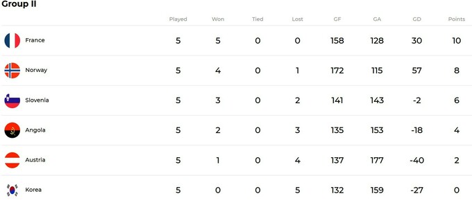 Группа 2: Норвегия, Франция, Словения, Австрия, Ангола, Южная Корея