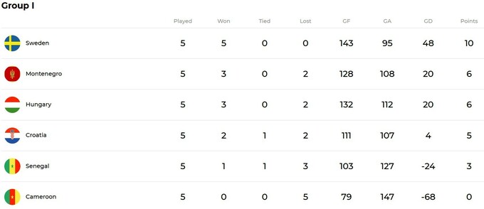 Группа 1: Черногория, Швеция, Венгрия, Хорватия, Сенегал, Камерун