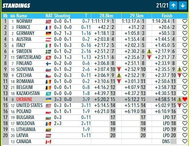 Лучшей в гонке стала сборная Норвегии, а украинская команда выступила не лучшим образом как по стрельбе, так и по скорости, финишировав лишь на 14-й позиции.