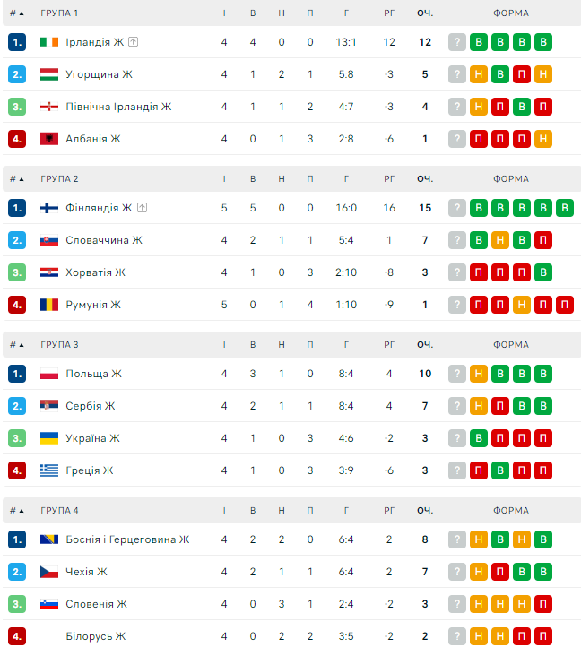Ліга націй B з футболу серед жінок. Турнірна таблиця