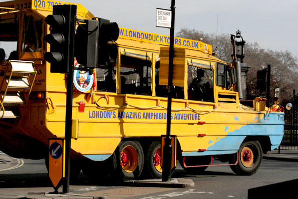 Эта амфибия сначала возит туристов по Лондону по дорогам, а потом съезжает в Темзу и катает по воде :)