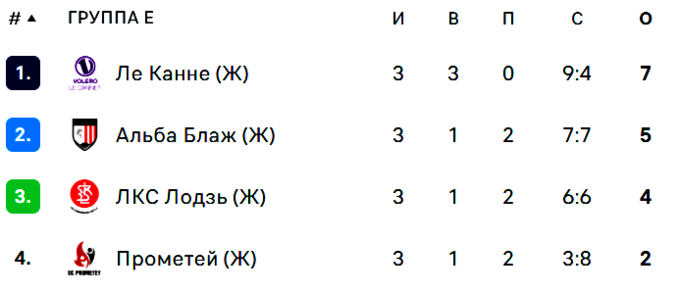 Украинский «Прометей», который в третьем туре в гостях победил румынский клуб «Алба Блаж» 3:2, пока имеет 2 очка и замыкает турнирную таблицу группы Е.