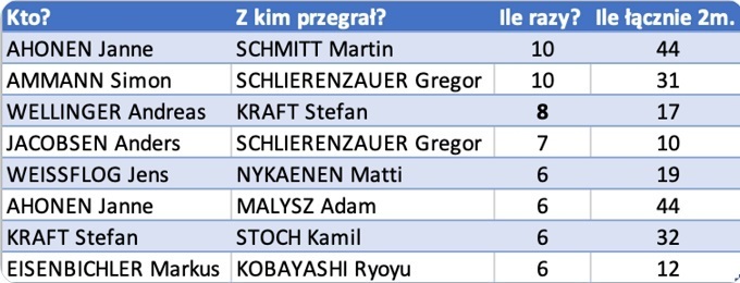 Вторым оба раза был Андреас Веллингер, который идет вторым и в общем зачете Кубка мира – правда, немец уступает Крафту уже 130 баллов. Суммарно за карьеру на счету Веллингера уже 17 вторым мест на этапах Кубка мира, и в 8 из этих 17 случаев он проигрывал именно Крафту. Чаще проигрывали только Янне Ахонен и Симон Амманн Мартину Шмитту и Грегору Шлиренцауэру соответственно – по 10 раз. Никто не удивится, если по ходу нынешнего сезона этот рекорд будет побит.