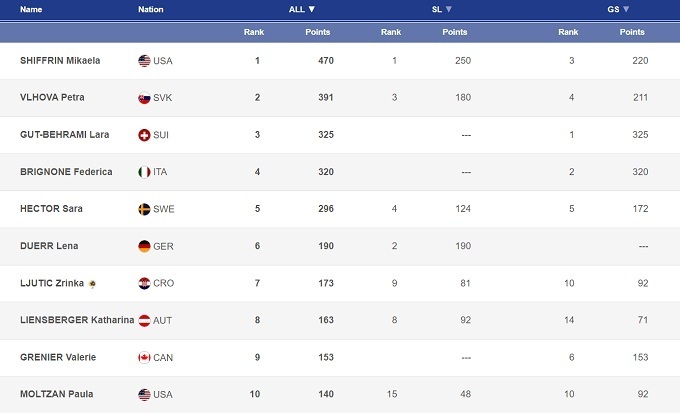 Третий и четвертый гиганты сезона выиграла Бриньоне, а первые два, как мы помним, остались за Ларой Гут-Бехрами. В Мон Тремблан швейцарка не смогла продлить свою победную серию, но выглядела очень солидно – пятое и второе места. Что касается Микаэлы Шиффрин, то она после шестого места в Зольдене в гиганте трижды подряд заняла третье место. В целом американке в нынешнем сезоне не хватает блеска и ураганных скоростей, но ездит она с профессорской точностью и расчетом, и никогда не ошибается – то, что нужно для общего зачета.