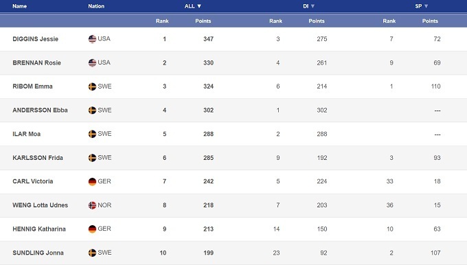 Если же говорить непосредственно о борьбе на трассе, то у женщин коньковую разделку с огромным преимуществом выиграла Джессика Диггинс. Американка гораздо выше уровня ожиданий выступила в Руке, и теперь настолько убедительно победила в Елливаре. Джесс возглавила общий зачет Кубка мира, и, с учетом проблем ее главным соперниц, выглядит фаворитом №1 в борьбе за Большой хрустальный глобус (БХГ). Хотя есть подозрения, что Диггинс явно форсировала форму на первую половину сезона.