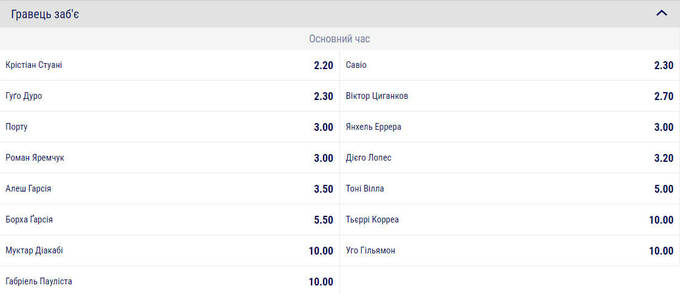 Интересно, что гол украинского футболиста жиронцев Виктора Цыганкова оценен в 2.70, а мяч украинского форварда «летучих мышей» Романа Яремчука – в 3.00.
