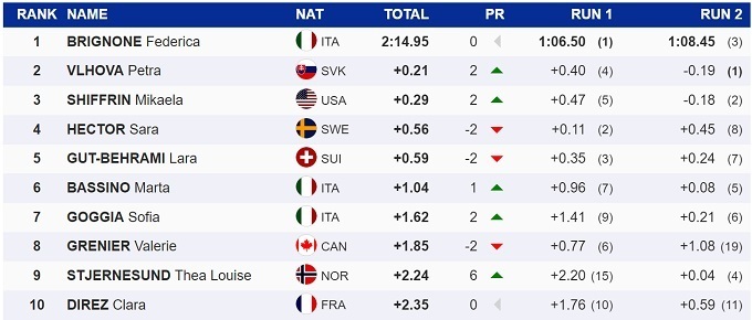 Бриньоне опередила словачку Петру Влхову и американку Микаэлу Шиффрин. Завтра, 3 декабря в Мон Тремблан состоится еще один гигант.