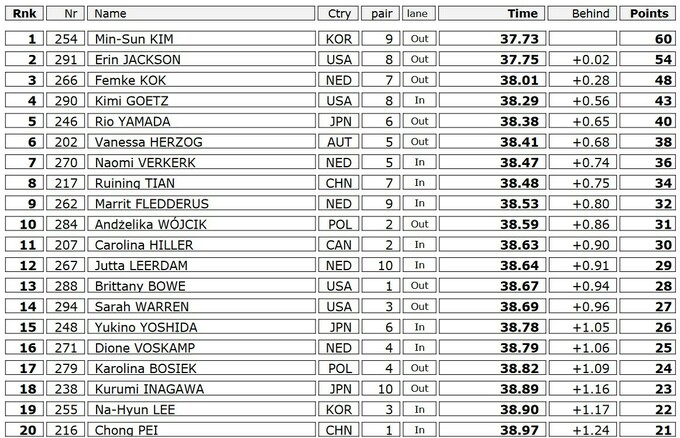Действующая обладательница Кубка мира Ким на 0.02 секунды улучшила время олимпийской чемпионки на этой дистанции, американки Эрин Джексон, и одержала первую победу в нынешнем сезоне. Кореянка и спортсменка из США стали единственными двумя конькобежками в сегодняшней гонке, которые выбежали из 38 секунд. Тех же 0.02 секунды не хватило для этого действующей чемпионке мира Фемке Кок из Нидерландов, которая стала третьей.