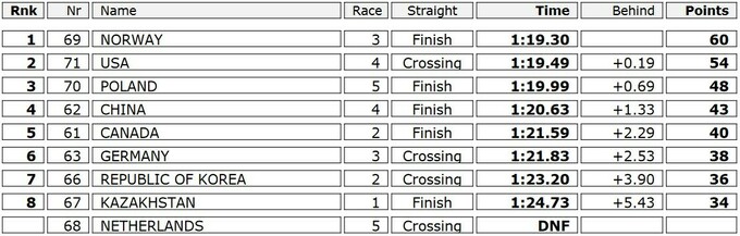 Остин Клеба, Зак Стоппелмур и Купер Маклауд, которые вышли на лед сразу после представителей хозяев, были близки к победе, но им не хватило менее 0.2 секунды. Чуть больше скандинавам проиграли поляки Марек Каня, Петр Михальски и Дамиан Зурек.