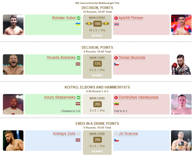 В другом поединке в Риге Ричард Болотник из Латвии (19–7–1, 8 KO) выиграл по очкам 6-раундовый поединок у чеха по имени Томаш Безвода (15–23, 10 KO).