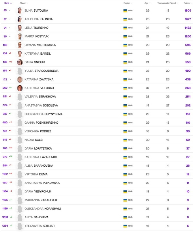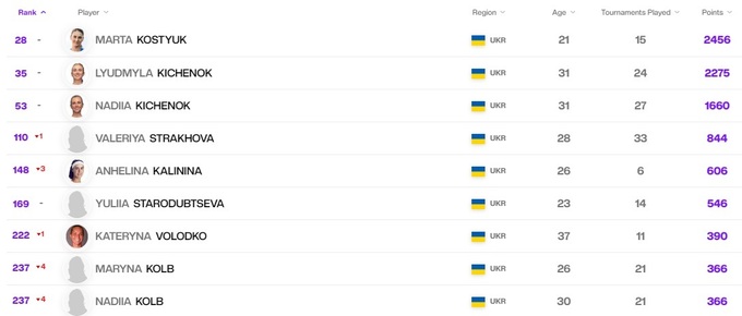 Украинки в рейтинге WTA