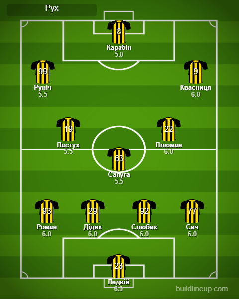 «Рух»: Ледвий – Сыч, Слюбик, Дидык, Роман, Сапуга, Плюман (Пидгурский, 80), Пастух, Квасница, Рунич (Соломон, 70), Карабин (Федор, 70).
