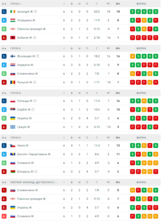 Также украинки не стали худшей третьей командой в Лиге В, так как Словения разгромно проиграла Чехии (0:4) и оказалась в рейтинге ниже Украины (с 6 очками по разнице мячей).
