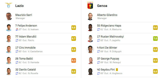 Оценки SofaScore за матч Лацио – Дженоа – 1:0