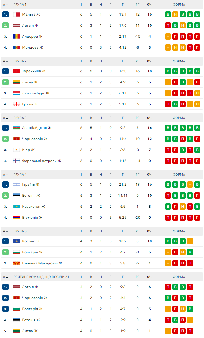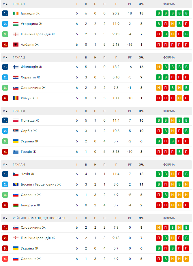 Также украинки не стали худшей третьей командой в Лиге В, так как Словения разгромно проиграла Чехии (0:4) и оказалась в рейтинге ниже Украины (с 6 очками по разнице мячей).