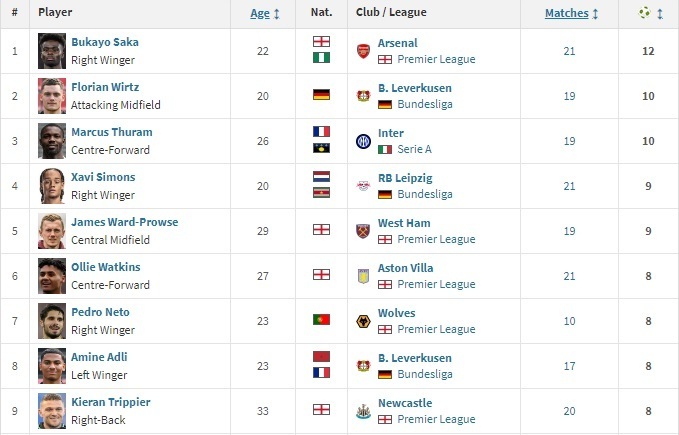 Полузащитник лондонского «Арсенала» Букайо Сака лидирует в списке лучших ассистентов с начала сезона-2023/2024 среди игроков в топ-5 лигах Европы.