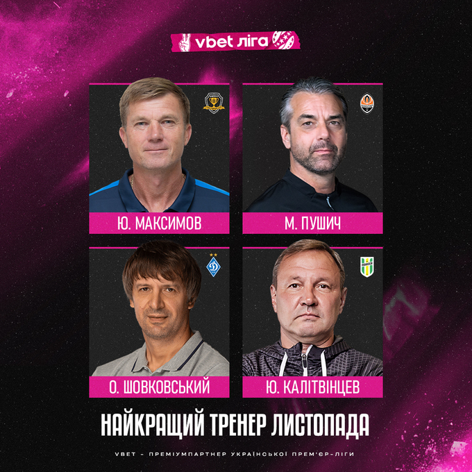 на звание «Лучшего тренера месяца» – Юрий Максимов («Днепр-1»), Марино Пушич («Шахтер»), Александр Шовковский («Динамо»), Юрий Калитвинцев («Полесье»).