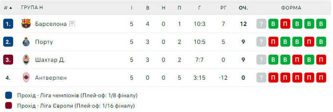 Сейчас «Порту» и «Шахтер» делят 2-е и 3-е место в квартете с 9 очками соответственно, играя вместе с «Барселоной» (уже гарантировала выход из группы) и «Антверпеном» (потерял шансы даже на 3-е место). Поскольку в 1-м туре группы донецкая команда проиграла 1:3, выше в таблице находятся именно португальцы.