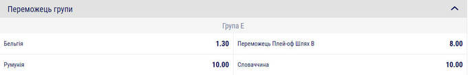 - Группа E: Бельгия, Словакия, Румыния, победитель плей-офф B (Украина)
